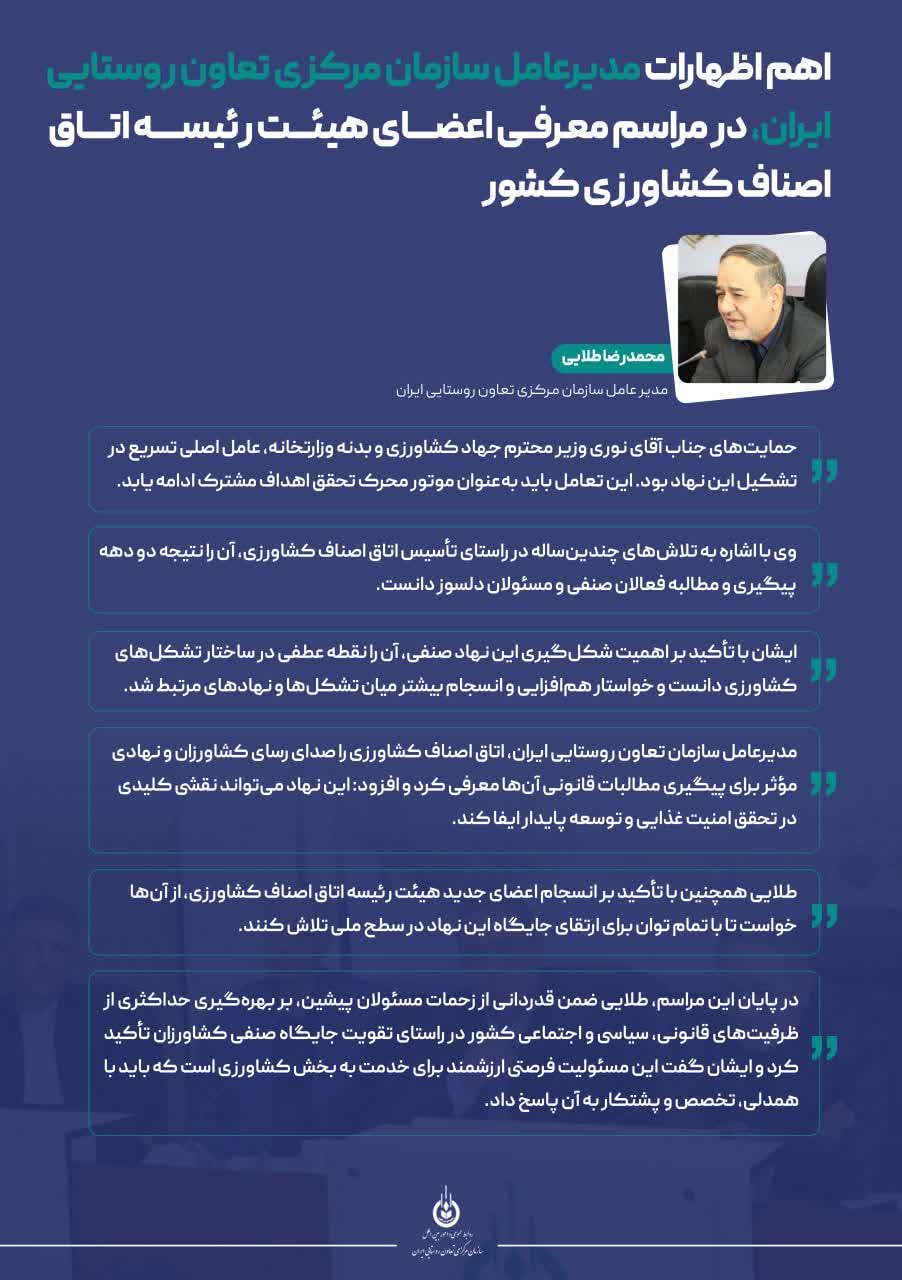 اهم اظهارات مدیرعامل سازمان مرکزی تعاون روستایی ایران در مراسم معرفی اعضای هیئت رئیسه اتاق اصناف کشاورزی کشور